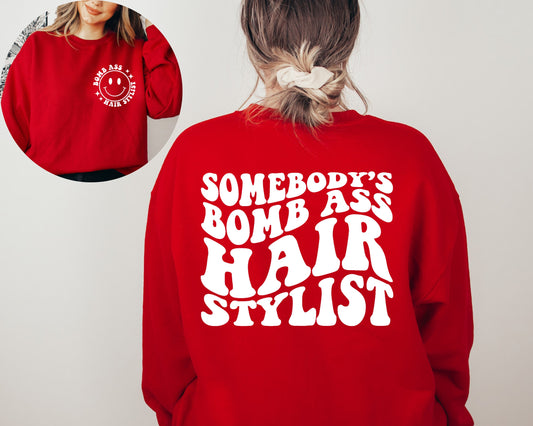 Somebodys Bomb Ass Hairstylist Sweatshirt, Hair Stylist Hoodie, Cosmetologist Sweatshirt, Words On Back Crewneck, Hairstylist Sweater