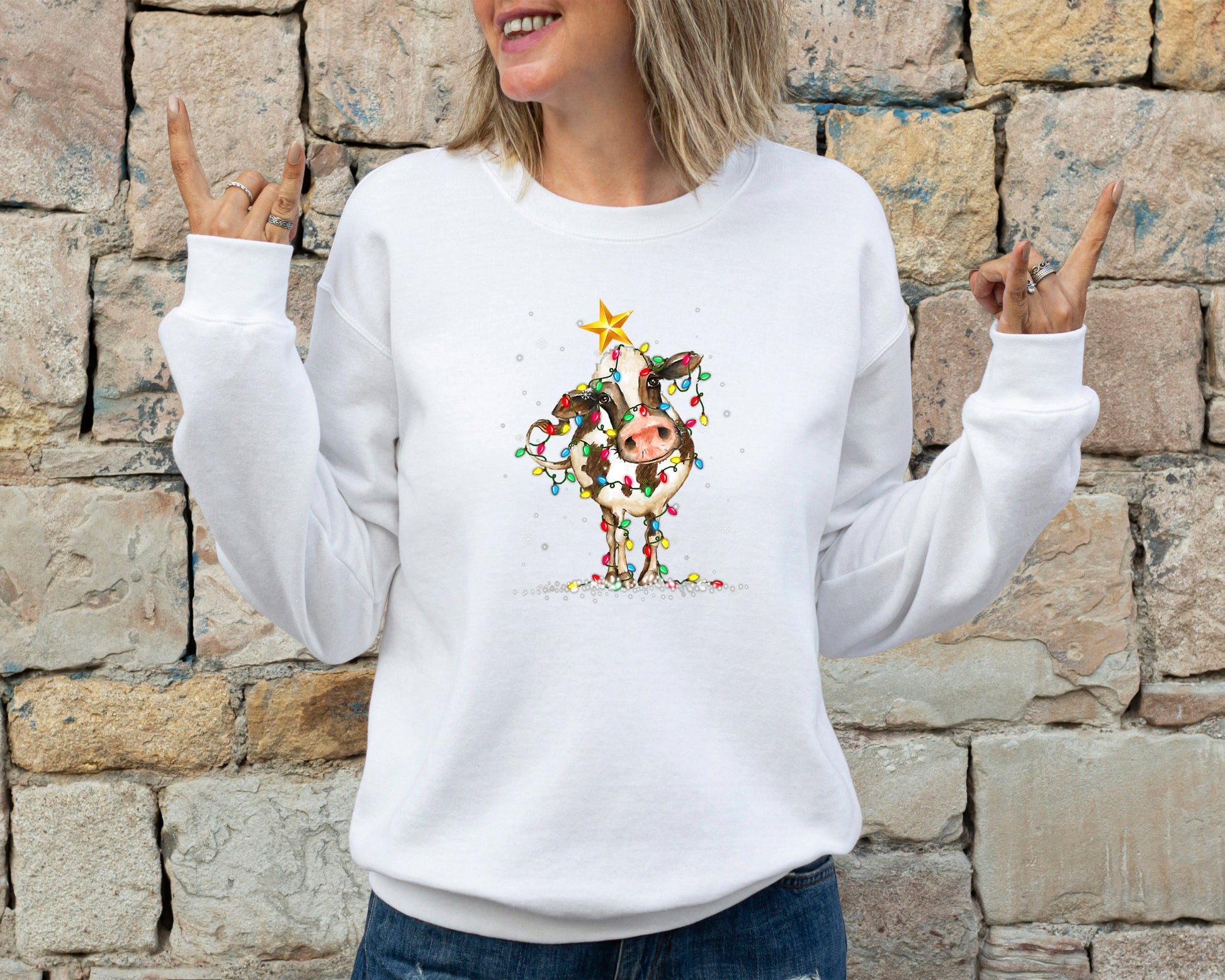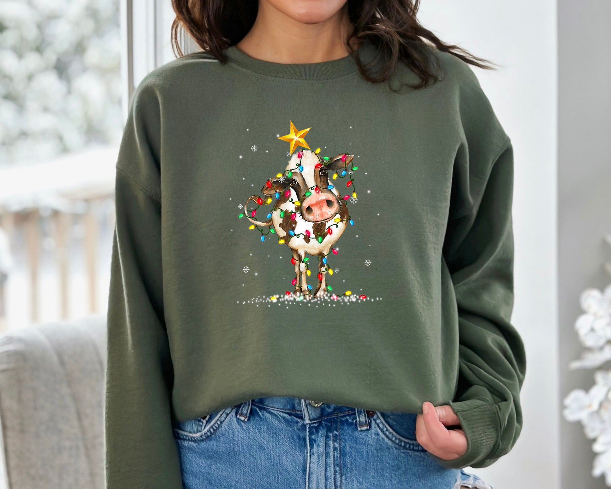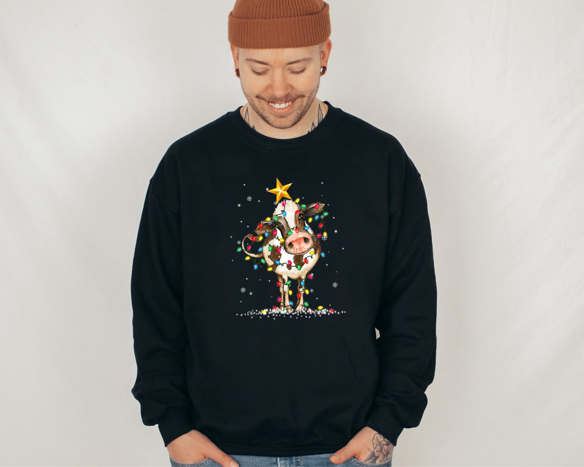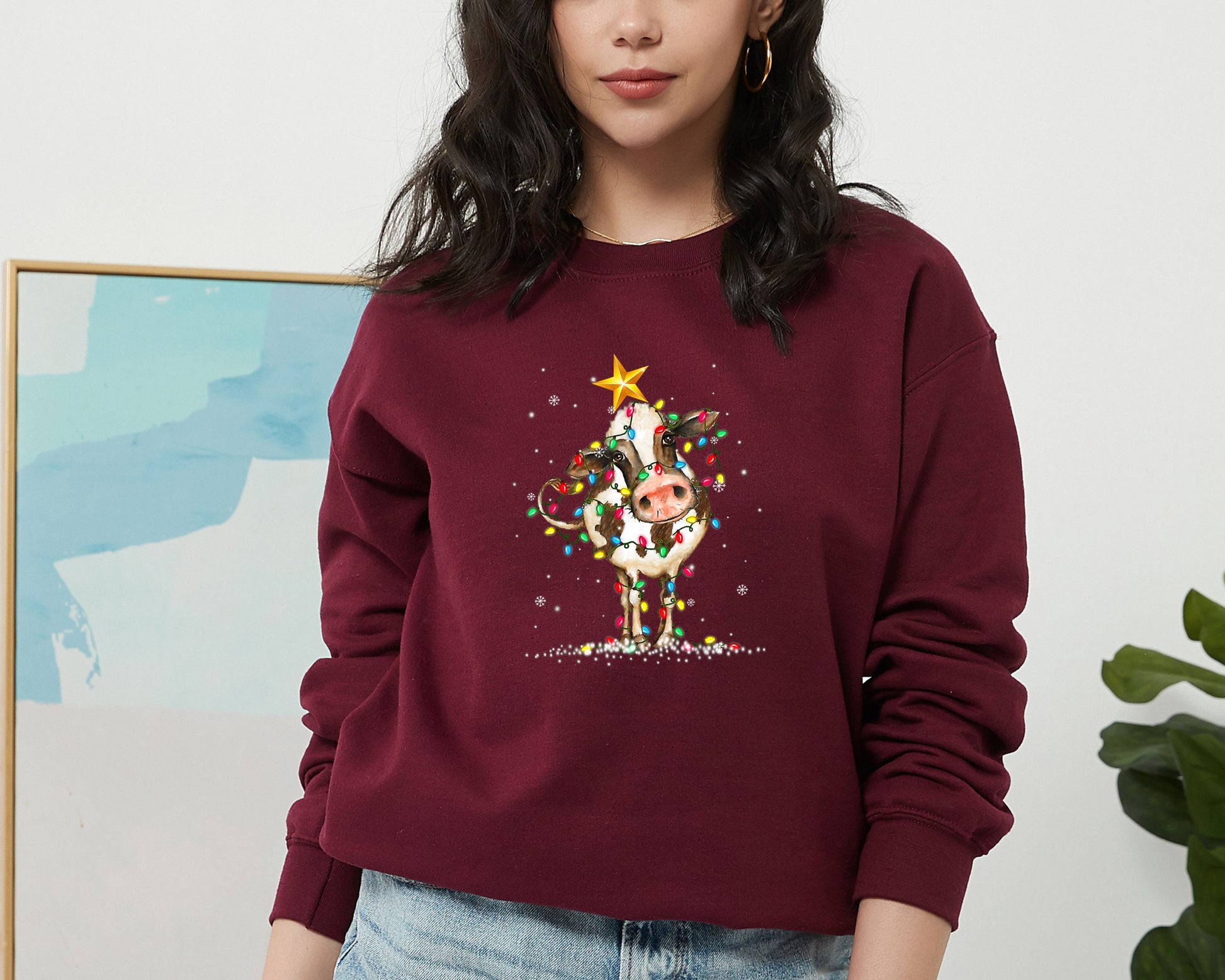 Cute Cow Christmas Lights Christmas Sweatshirt, Funny Christmas Sweater, Cow Holiday Hoodie, Cow Lover Xmas Gift, Farm Christmas Crewneck